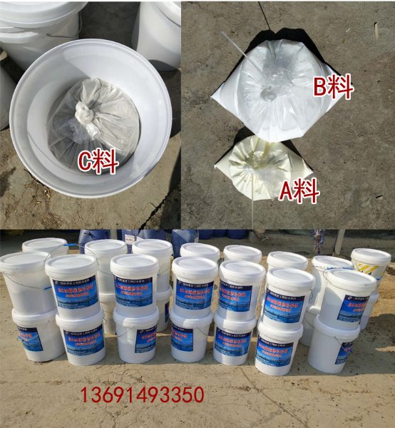 3、将A料、B料摇匀后,分别倒入桶中,并充分搅拌均匀后,再将标有C的粉料边搅拌边慢慢地倒入桶内,搅拌成均匀的砂浆状即可。如果混合后较粘稠或不易搅拌均匀,本包装可加入1-2kg的洁净水搅拌,不影响本品的终性能。