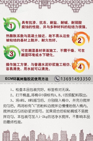 3、拌好的环氧砂浆宜在2小时内用完,在此时间内如出现变干变稠的状况可以加适当的水搅拌均匀后再用。
