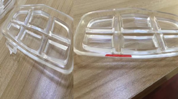 由于切刀实际上也承担一部分成型的作用,所以分离水口料过程也是挤压成型过程,塑料产品上除了存在切刀和导向块的镶拼线外,没有残料产生。由于浇口分离处与产品共面,虽然有手感,但对产品外观的影响是不明显的。产品应用普通侧水口的情况下,使用手工去除侧水口后,产品表面存在粗糙而泛白的残料区,而且R角外观特征已呈残缺状。右图产品应用模内热切分离浇口后,没有残料,外观面与切口同样光滑,色泽无明显差异,外边缘R角特征完整。镶拼线的效果在产品上显示并不明显,高低台阶在0.05mm以下,