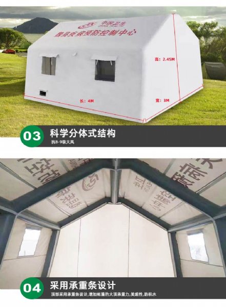 采用结构力学的原理设计框架,利用气体压强特性将气囊膨胀形成具有一定刚性的柱体,经过有机组合撑起帐篷的骨架。随着采用的骨架材料的强力大小,可以设定帐篷的称重大小;采用高分子涂层的性能优劣,决定着框架的使用寿命与框架刚性的维持;而气室设定的合理性,则决定着这个框架的撑起极限。