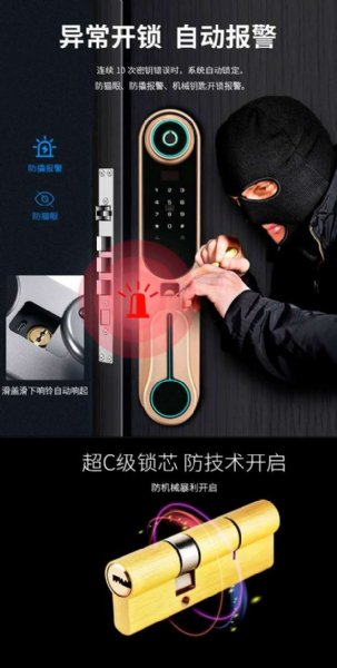 本品有防盗猫眼,一键反锁,报警提示,多种解锁方式,全触摸屏,操作简单,国标级铝合金锁身,超C级锁芯,一握即开,远程智控,欧菲光半导体
