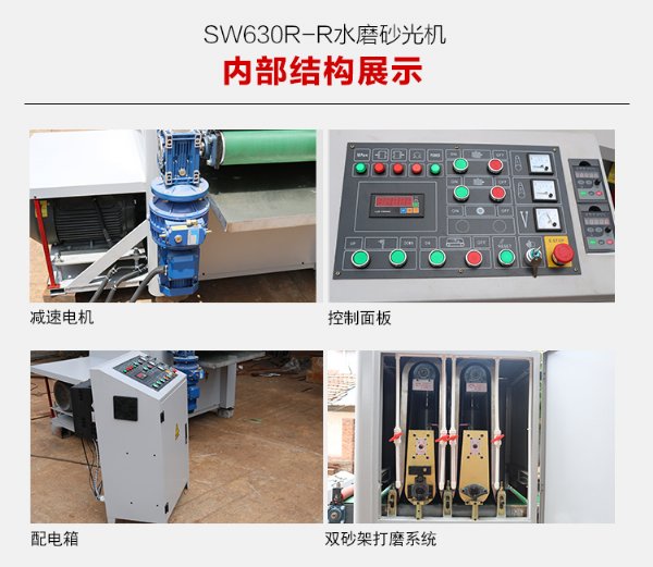 砂光机,本机为双辊式水磨砂光机,借助喷水装置和水循环系统,采用湿法砂光,对金属类和石材表面进行拉丝抛光处理。采用特殊材料及工艺制作的软性