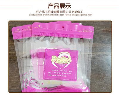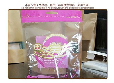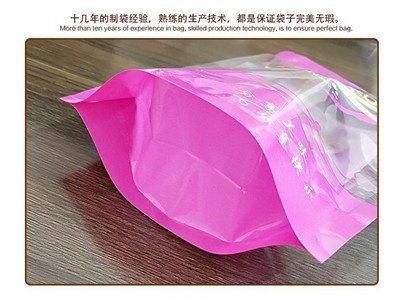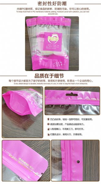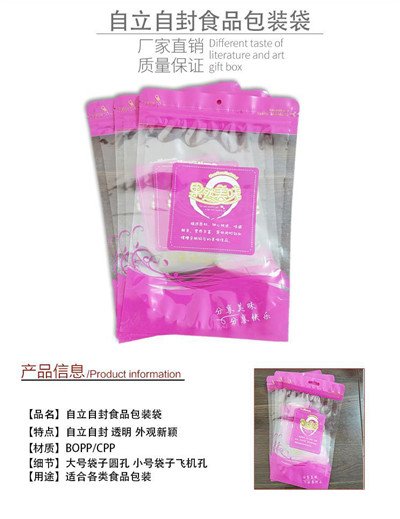 分类介绍 可以重新封闭和重复开启,由于采用拉链形式并不封闭且封闭强度有限,所以种形式不适于封装液体及易挥发物质。根据封边方式不同又分为四封边和三封边两种,四封边是指产品包装在出厂时拉链封口之外还有一层普通封边,使用时需先将普通封边撕开,再利用拉链实现重复封启,这种方法解决了拉链封边强度小不利于运输的缺点。而三封边则是直接用拉链封边作为封口,一般用于盛装轻质产品。带拉链的自立袋一般用于包装一些质轻的固体,如糖果、饼干、果冻等,但四封边的自立袋同样可用于包装大米,猫砂等较重的产品。