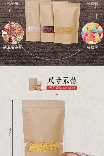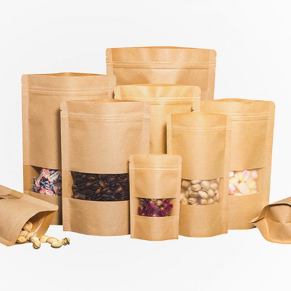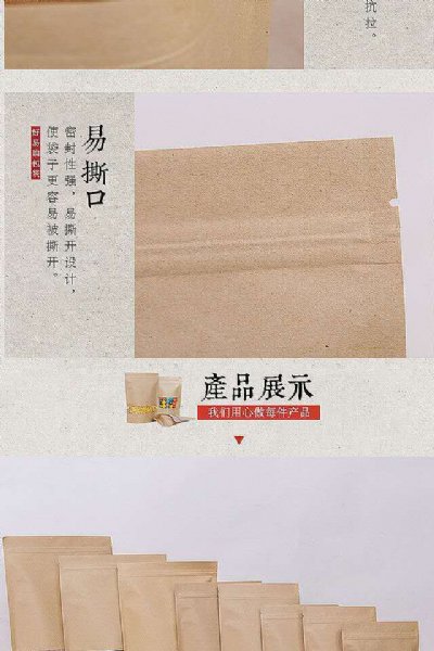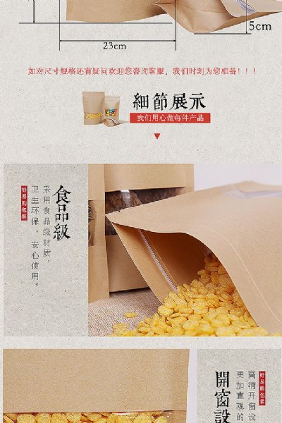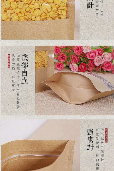 开窗牛皮纸自封袋主要将牛皮纸,PE膜 [4]  (用普通设备制作夹链自封袋 [5]  ),哑光磨砂膜,通过复合工艺将这几种材料压合在一起,形成美观大方的具有磨砂可视的复合袋 [6]  包装袋。不开窗牛皮纸自封袋主要铝膜,牛皮纸,磨砂PE膜三层复合在一起,形成不可视不开窗口袋。八边封牛皮纸自封袋是通用模具将袋型做成立体包装袋,因牛皮纸立体袋有八条边而得名“牛皮纸八边封袋”。