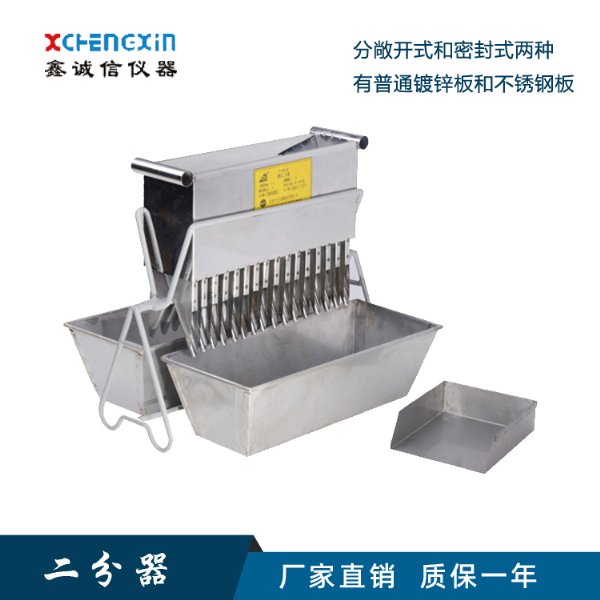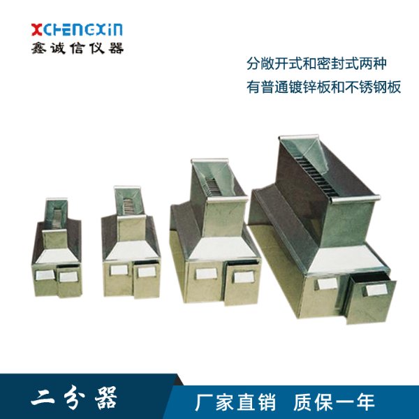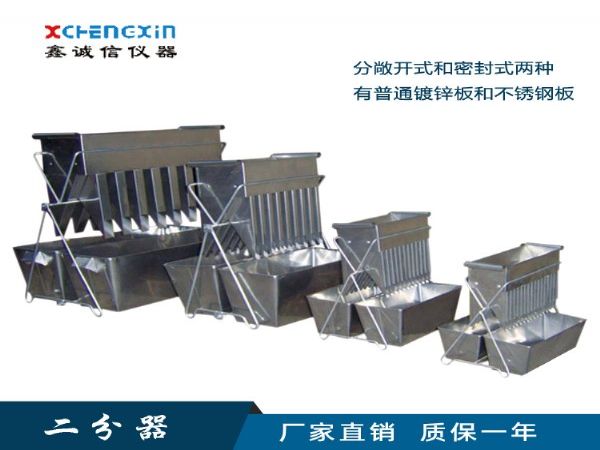 通用型二分器由分样槽、分样斗、接样器、架子和簸箕组成。适用于煤、矿石或其他不均匀粒状物料的缩分取样分析,每套二分器分4种不同规格,分别适用于不同粒度的样品缩分。