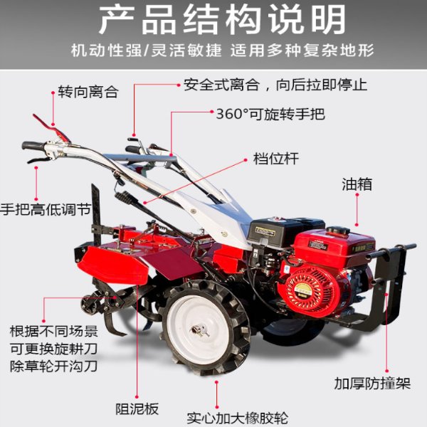 1、 采用直联式传动,特别适用于山区,丘陵,旱地,水田,果园,菜田及大棚作业。