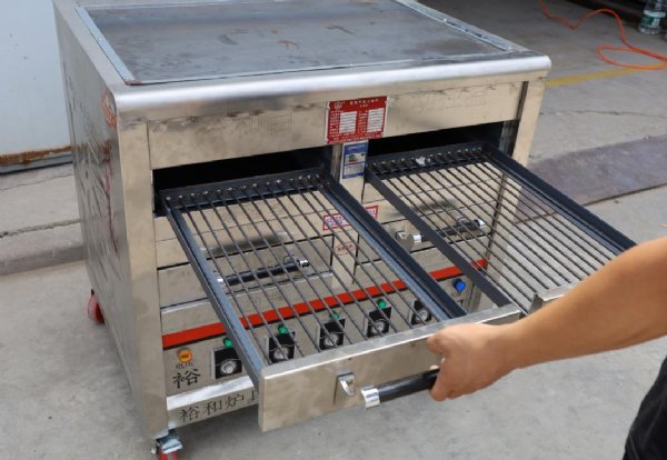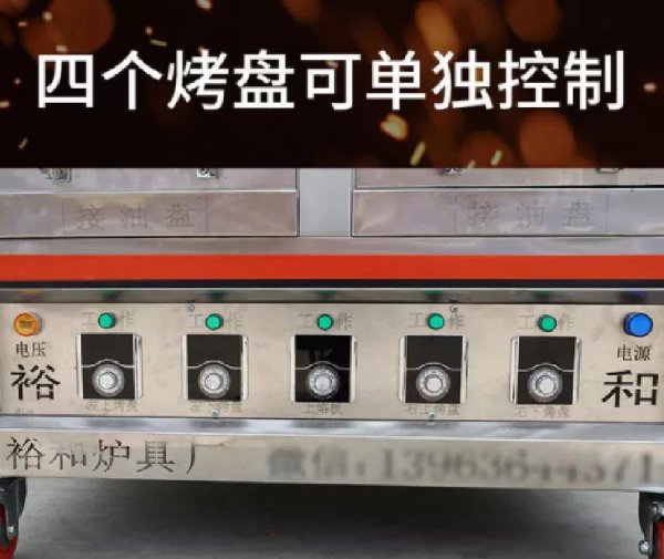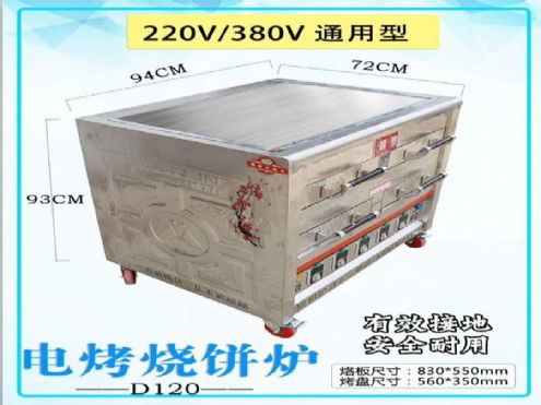 电热管,寿命长,温度随意调节,自动控温,高效节能环保,上面烙,下面烤制,烤盘可以单独开关,省电易操作,烤盘尺寸360mm 烤盘四个,左右各两个,可以烤制60个火烧,烙板,可以单独开,烙饼,做灌饼都可以的,河南烧饼,莱芜火烧,泰安火烧,北京烧饼,潍坊肉火烧,硬面火烧,芝麻酥皮火烧,山西膜,广泛用于各种火烧店,驴肉火烧店,市场摊点,超市等,全钢制造。优点是省时省力,缺点是考出来的火烧口味不如燃煤的酥脆,香软。