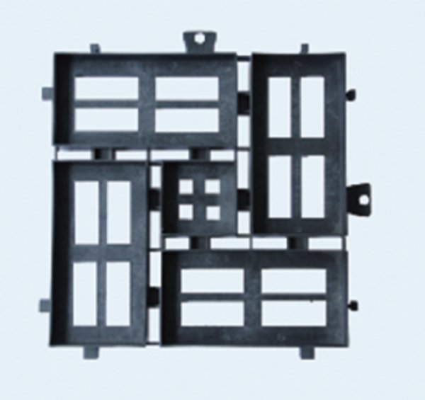 用于铺设在市政人行道、园林景观小径、非承载路面广场、停车场等,一种以橡胶和塑料为主要原材料,经模具加压注塑制成的透水铺装模框。框体设有砖槽、透