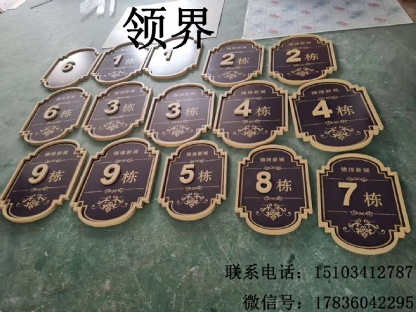 悬挂于建筑之上的楼栋牌高度一般在80公分到一米二之间,高层建筑由于悬挂的略高一点,会相对较大一点,多层建筑的楼栋牌会相对较小一点。楼栋牌一般多是竖长的,因为透视的原因,人在仰望的时候看到的东西都会竖向压缩。别墅楼栋牌悬挂的就比较小一些,高度多在65公分左右。如果是竖于门前的楼栋牌,高度多在米之间。