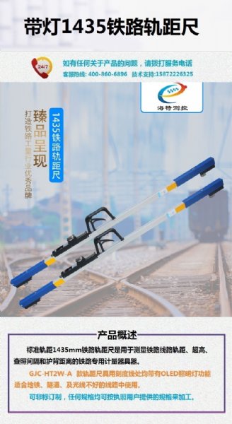 【产品特点】标准轨距1435mm铁路轨距尺是用于测量铁路线路轨距、超高、查照间隔和护背距离的铁路*计量器具。通过刻度轮盘、水泡来显示超高。具有刻度线处均带有LED照明灯功能适合地铁、隧道、及光线不好的线路中使用。