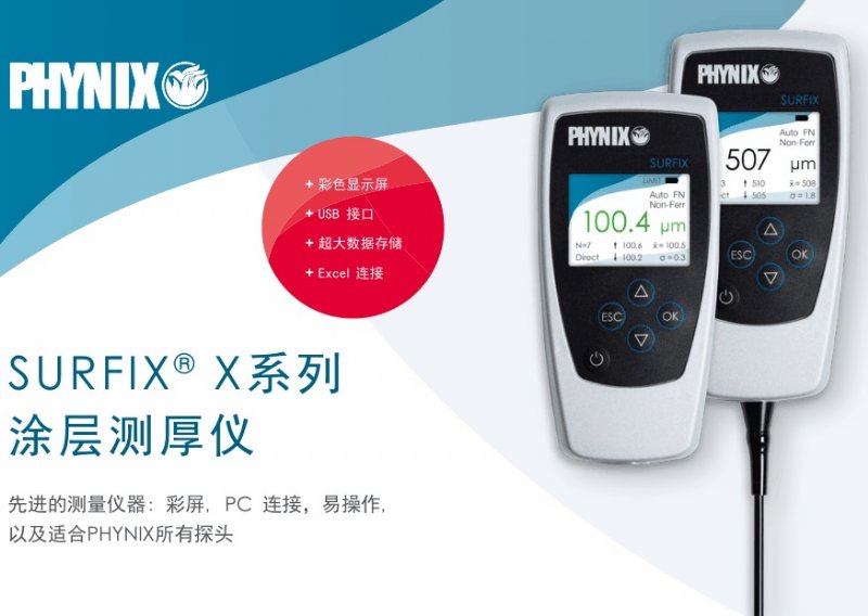 相对于Surfix系列,此系列的内存也提高了很多,可以存储多达2.000的测量值。与电脑的链接非常简单,是通过 USB2.0. PHYNIX.connect 实现的。这是一个数据传输程序,和所有Windows系统兼容, 可以使数据方便地输进Excel。此系列有两种产品: Surfix® SX 可以连接所有PHYNIX探头,使得仪器可以满足很多测量任务。Surfix® EX 带有固定标准探头,适合任务明确的测量。和Surfix® SX 配有可拔插探头相比,它易操作,更经济。