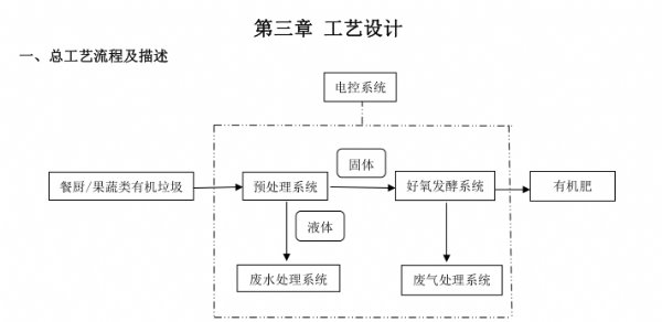 餐厨/果蔬类有机垃圾先进入“预处理系统”,处理完成后,固体物料进入“好氧发酵系统”,进行好氧发酵堆肥,*终的产出物为有机肥,好氧发酵产生的废气进入“废气处理系统”,经过处理后达标排放,液体进入“油水分离系统”处理,整个系统通过“电控系统”实现自动化控制、数据自动传送存储和