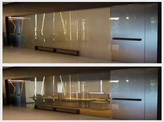 钢化(非钢化)调光玻璃通电时,在电场作用下,钢化(非钢化)调光玻璃中间的高分子液晶材料有序排列,使光线能透过玻璃,这时看到的效果便是透明无色的玻璃状态。