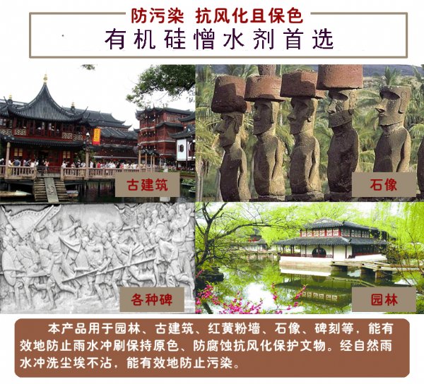 有机硅憎水剂是一种*、无刺激性的新型高效防水材料,为世界先进国家所广泛应用。本产品喷涂(或涂刷)于建筑物表面后,可在其表面形成肉眼觉察不到的一层无色透明、抗紫外线的透气薄膜,当雨水吹打其上或遇潮湿空气时,水滴会自然流淌,阻止水分侵入,同时还可以将建筑物表面尘土冲刷干净,从而起到使内墙防潮、防霉、外墙洁净及防止风化等作用。