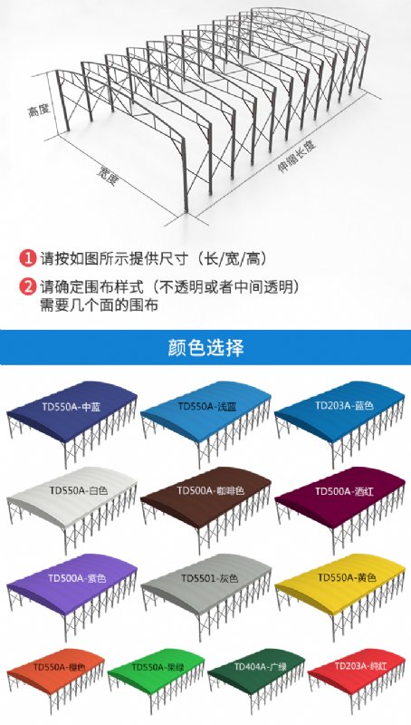 用途:品质优良,在强烈阳光下不会脱色,跨度可做到20M中间不用加柱子,适用于工厂临时仓库,大排档,物流出货,商铺挡雨,汽车防晒,大型活动场所厂等起到非常好的遮阳、挡雨、装饰的效果。
