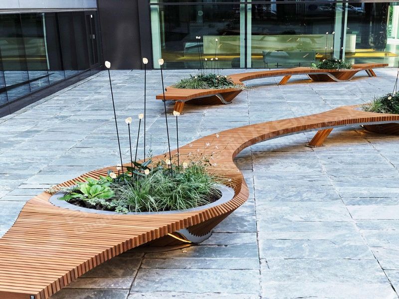 公园椅凳,其本身也有很好的审美价值,让公园的座椅设施完全融入到公园的精致当中,是很好的设计形式。