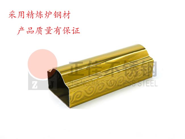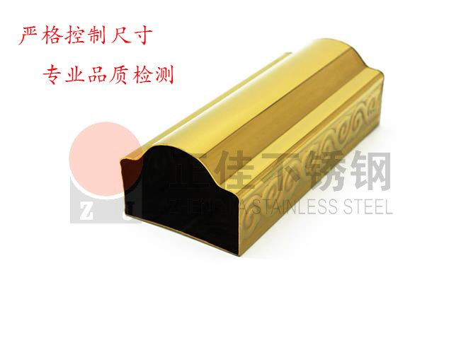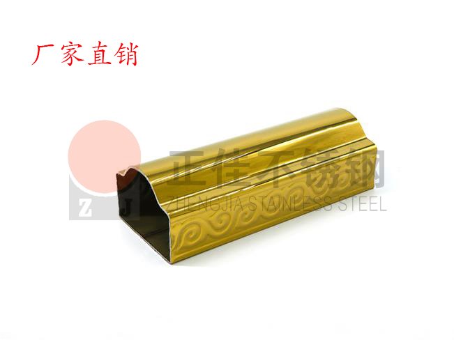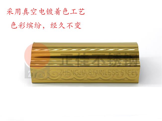 不锈钢装饰管的基础上,通过辊压工艺,把各式各样的花纹图案压印出来。而正佳的76x51镀金祥云彩色不锈钢装饰管的表面就拥有祥云花纹,十分受新老顾客的欢迎。不仅如此,其表面还采用了真空电镀着色工艺,使其表面呈现出钛金色。其材质是304,耐腐蚀性能显著。