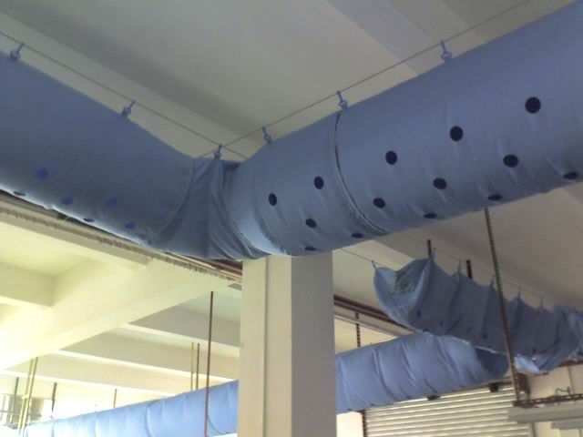 杰尼斯纤维布袋风管广泛应用于超市、商场、会展、剧院、办公楼、医院、图书馆、游泳池、体育馆等商业公众场所;各类体育场所;电子、化工、医药、机械、印刷等工业厂房以及各类食品厂房。