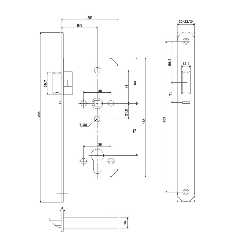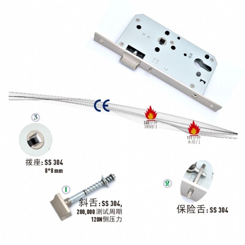不锈钢锁体性能符合欧标 EN12209, 锁体尺寸符合DIN18251;