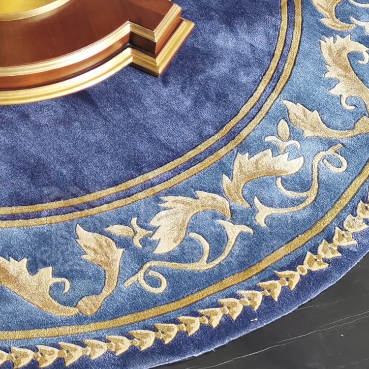 这款蓝色欧式圆形地毯,是以新西兰南岛的罗姆尼羊产的羊毛纺成的新西兰羊毛纱线,根据图案确定颜色,用瑞士克莱恩染料对纱线进行染色,织成地毯。