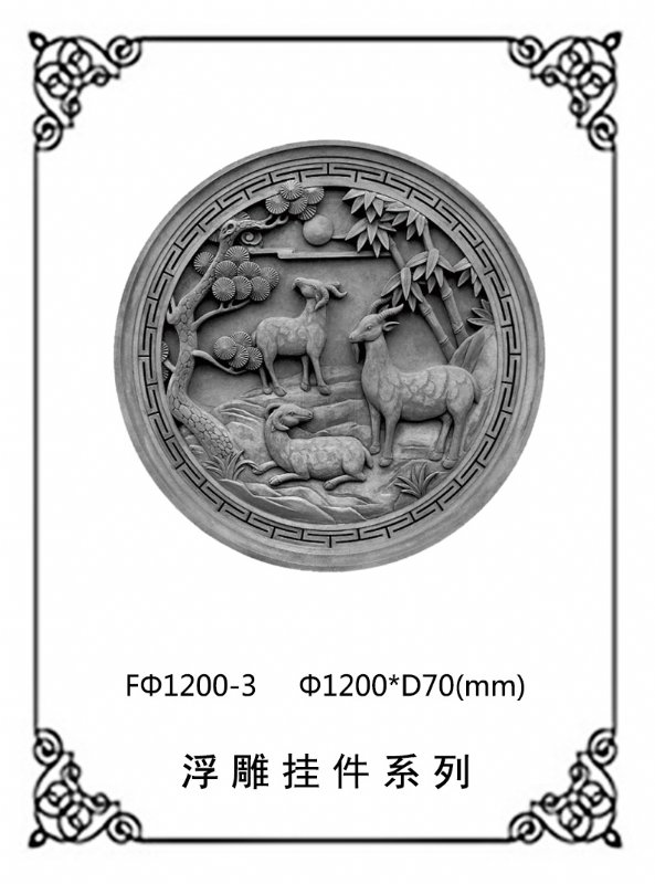 仿古砖雕也有“三阳开泰”圆形浮雕图,图上雕刻有三只羊,即有“三阳(羊)开泰”的祈盼。