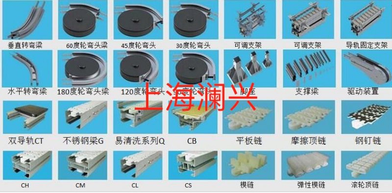 柔性输送线配件:柔性链板,输送梁,驱动头尾,脚座,护栏,弯段,耐磨条等,品种规格齐全。适用于