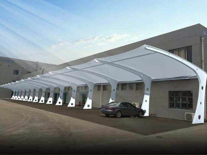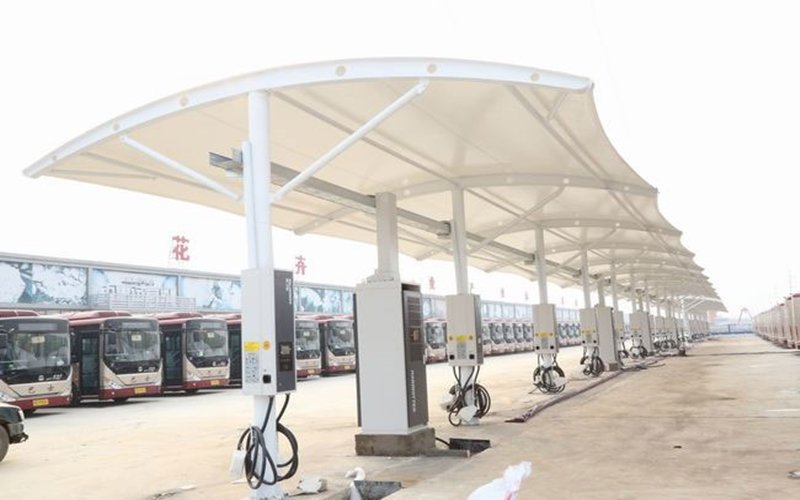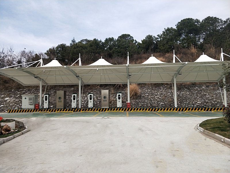 充电桩车棚,高强度柔性薄膜材料与支撑体系相结合形成具有一定刚度的稳定曲面,能承受一定外荷载的空间结构形式。其造型自由轻巧、阻燃、制作简易、安装快捷、节能、易于、使用安全等优点,因而使它在世界各地受到广泛应用。