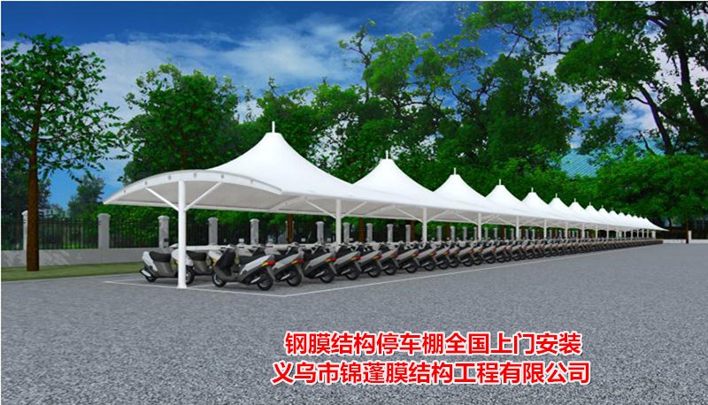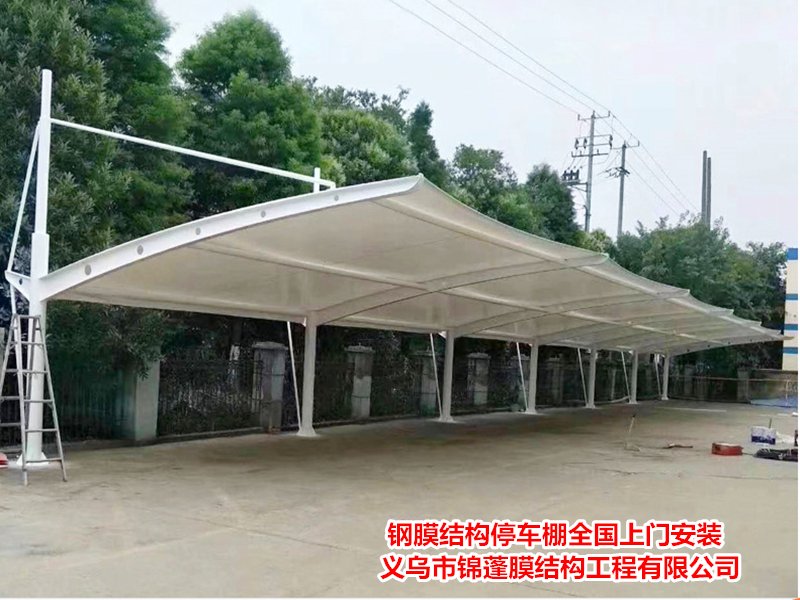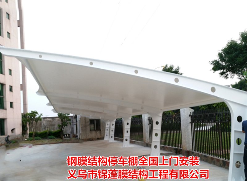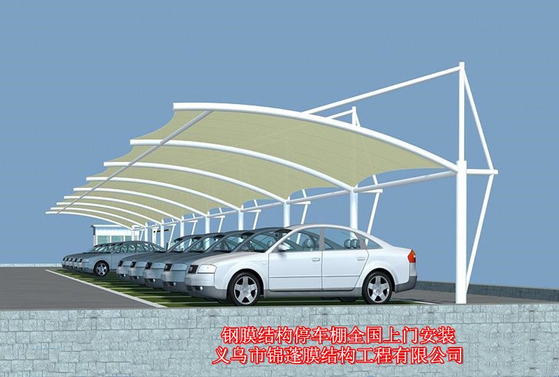 膜结构停车棚自重轻,具有良好的受力特点——成为大跨度空间结构的主要形式之一。停车场的规划和建设成为现代城市规划的重要组成部分,在以后的建设里会变得越来越重要。膜结构轻巧、别致的造型在停车场及候车厅的建设中担当了重要角色,除了满足防风雨、防日晒等基本功能外,并有较好的标识招揽效果,展现了人们个性化的一面。柔性材料具有透光和防紫外线功能,在一些室外建筑和环境小品中得到广泛的应用。正是由于这一特征,夜间的灯光设计使膜结构具有鲜明的环境标志特征。