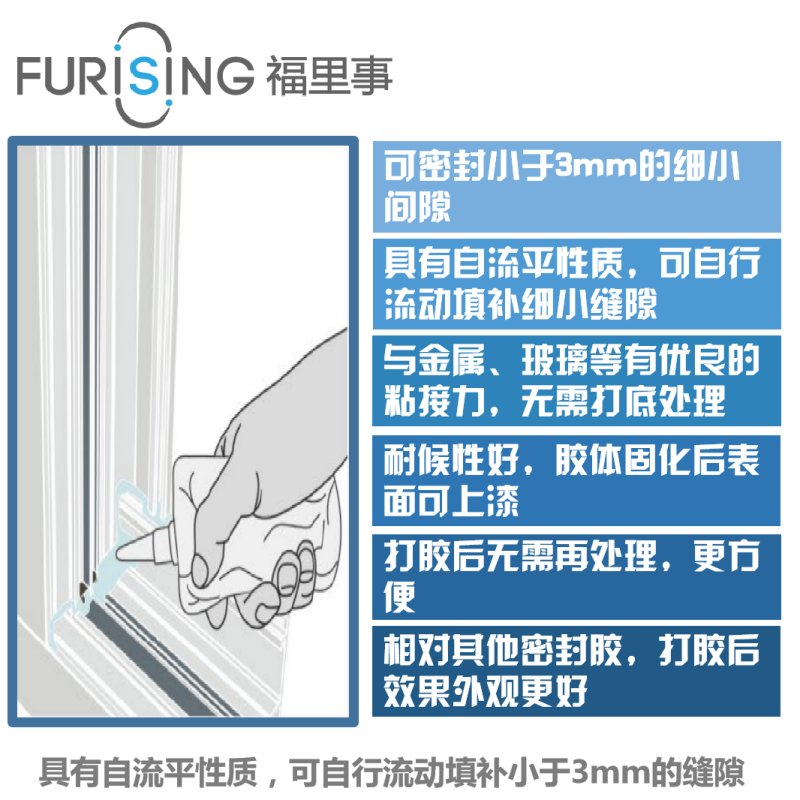 ①FUR005是一种可自行流动,并能自行渗透金属细小缝隙将其完全覆盖密封的单组份密封胶。