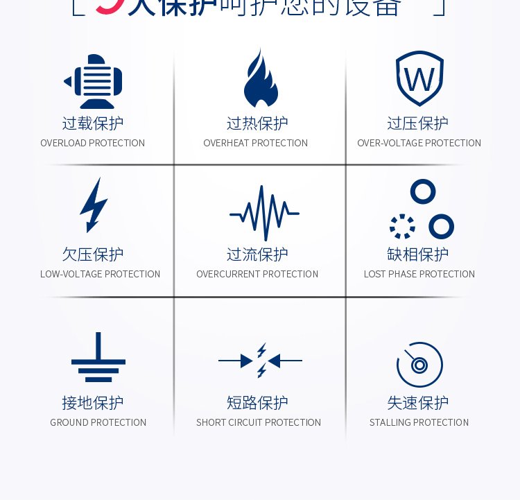 ⊙提供多种故障保护功能:过流、过压、欠压、过温、缺相、过载等保护功能