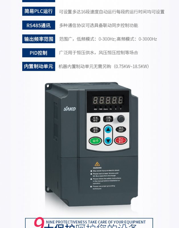 ⊙0.75KW~15kW各规格内置制动单元,如需快速停车,可直接连接制动电阻;