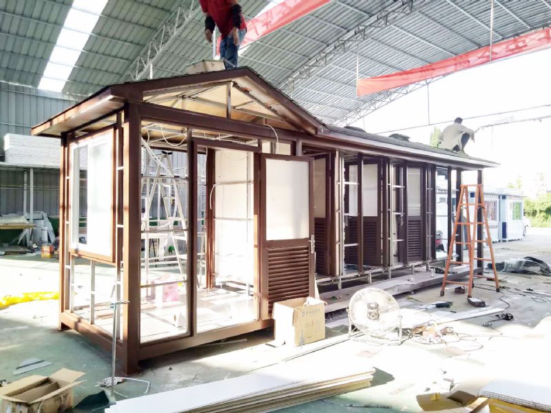 镀锌管焊接,底部先铺设红木板再铺防滑胶地板,内面墙订豪华墙板,用豪华扣板吊顶,外墙订雕花板,顶上先订红木板再铺