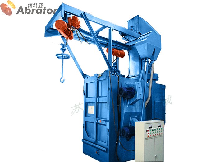 双吊钩式抛丸机由两个吊钩装载工件交替进入抛丸清理室内。利用抛丸器将0.2~0.8的弹丸抛向工件的表面,使得工件的表面达到相对的粗糙度,让工件变得美观,或者改变工件的压应力提高寿命。
