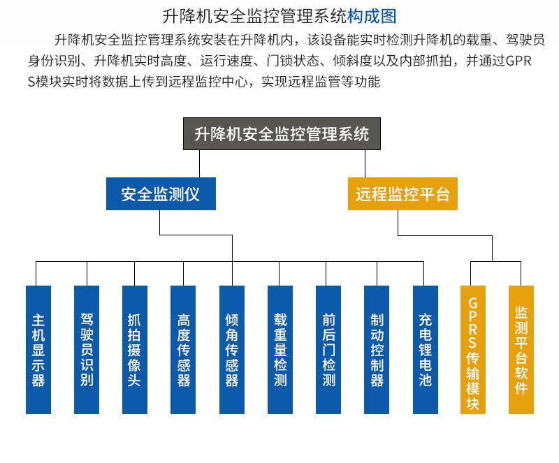 系统由安装在施工升降机内部的安全监测仪和施工升降机远程监测管理平台两部分构成。
