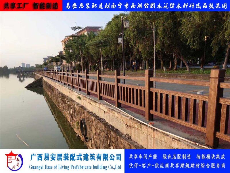 仿木护栏,还能制作出古朴、稳重大气的仿木栏杆。在水利河道、市政桥梁、水库堤坝、公路交通、园林景观、城市绿化、小区别墅、学校机关等室内外场所,所到之处、处处实用,美景与绿化尽收眼底,时尚与典雅随身而至。安装以榫卯方式连接仿木栏杆各部件,后以填充混凝土为内空主体。成品抗压强度和抗弯强度较高,稳固性与抗冲击力强,能抵抗12级台风及8级地震,强度普遍高于市面上