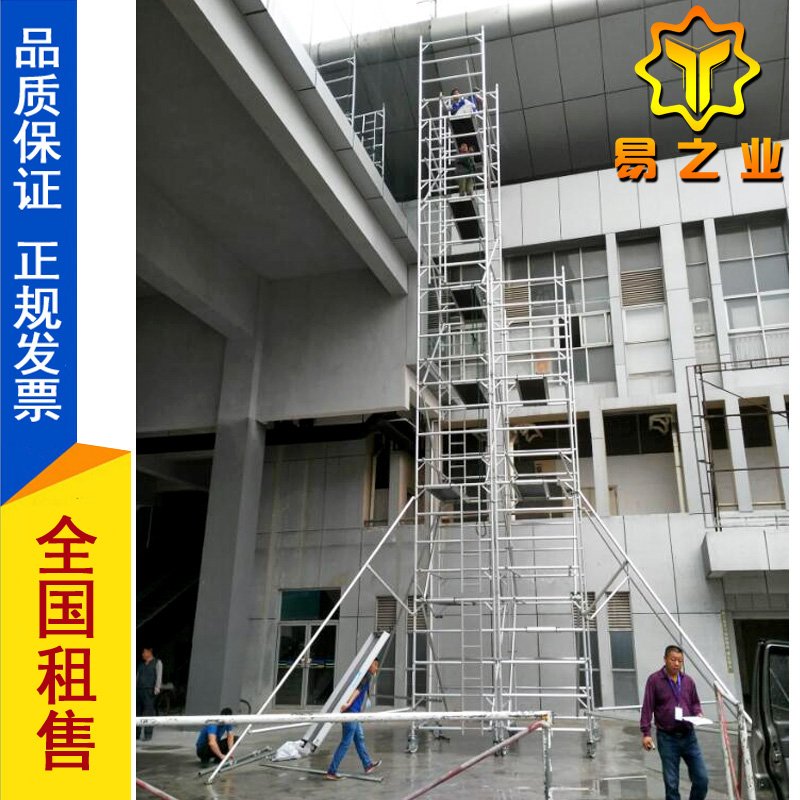 材质:航空铝合金6061-T6,管直径:50 mm,管壁厚:2.0mm 平台每平方承重200KG;整塔承重900kg,第二层及以上为了安全考虑我们建议加装外架斜支撑。