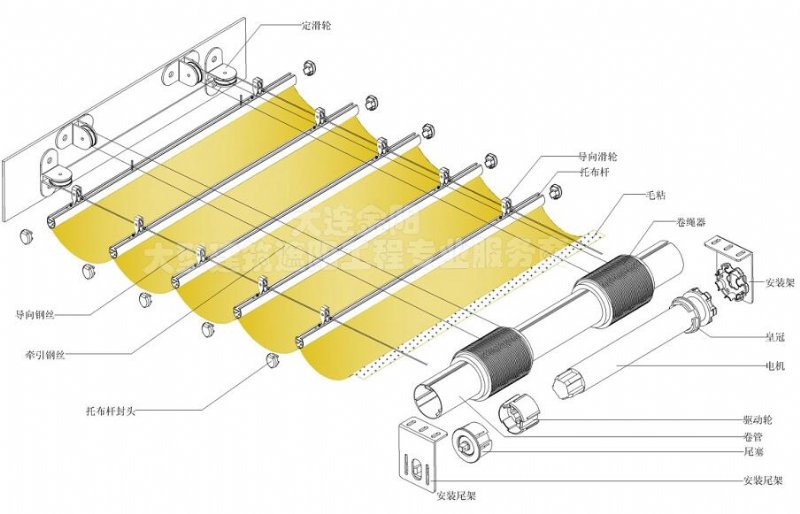 弹簧滑轮,钢丝通过滑轮进行换向,使一根钢丝的两端能同时固定在卷绳器上,并用钢丝始终保持绷紧。面料部分的上半部是一根两端固定并绷紧的钢丝(电动天棚帘跨度过大时改用滑动门轨),下半部分为面料,面料从顶端开始安装引布轴,间距等分(通常为1m左右)。引布轴上安装滚动滑轮,滑轮在固定的钢丝上滚动。*一根引布轴与传动钢丝联接,在电机带动下面料沿着固定钢丝展开,收拢。