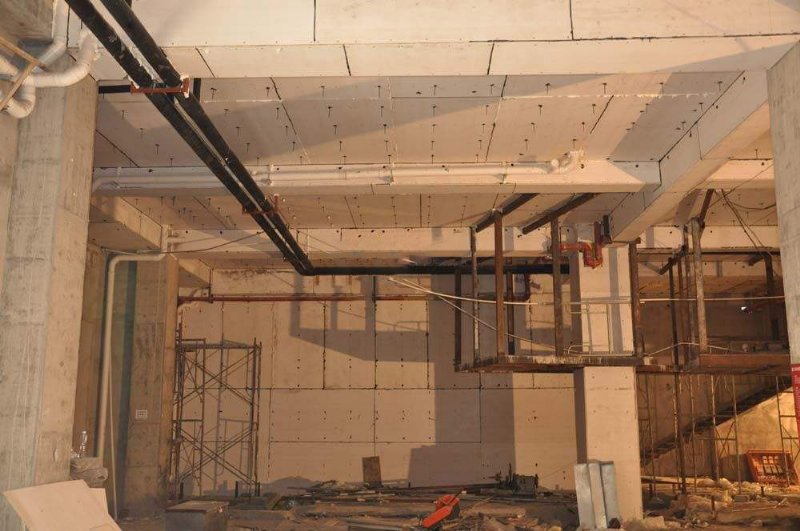 2、走廊处天花板的具体做法:在走廊处天花板外饰面固定吸音装饰一体板;