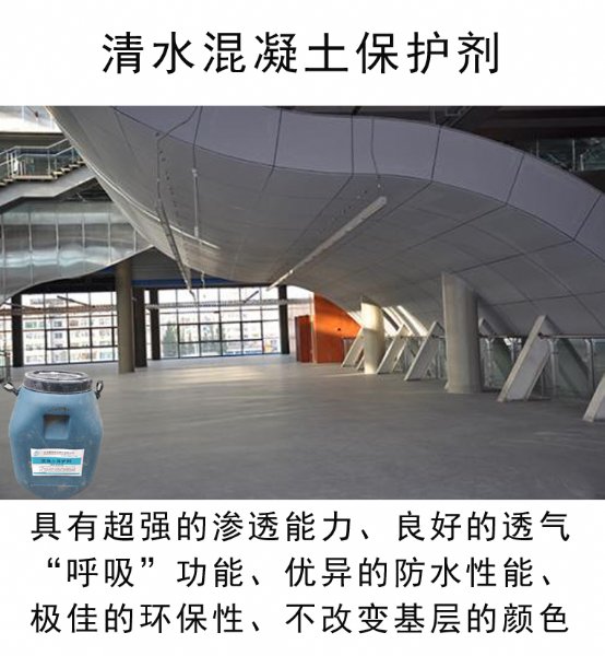 打造出的清水混凝土效果,一般的清水混凝土保护剂利用“浸渍”保护原理,采用高纯度的异丁基三乙氧基或异辛基三乙氧基(这也是国家混凝土行业耐久性防腐规范中*的产品),利用特殊的小分子结构,穿透混凝土表面深层,渗入内部几个到十几个毫米,,分布在混凝土毛细孔内壁,形成坚固、刚柔的防腐渗透斥水层,同时因为它不阻塞气孔,可以有效保持基材的透气性。