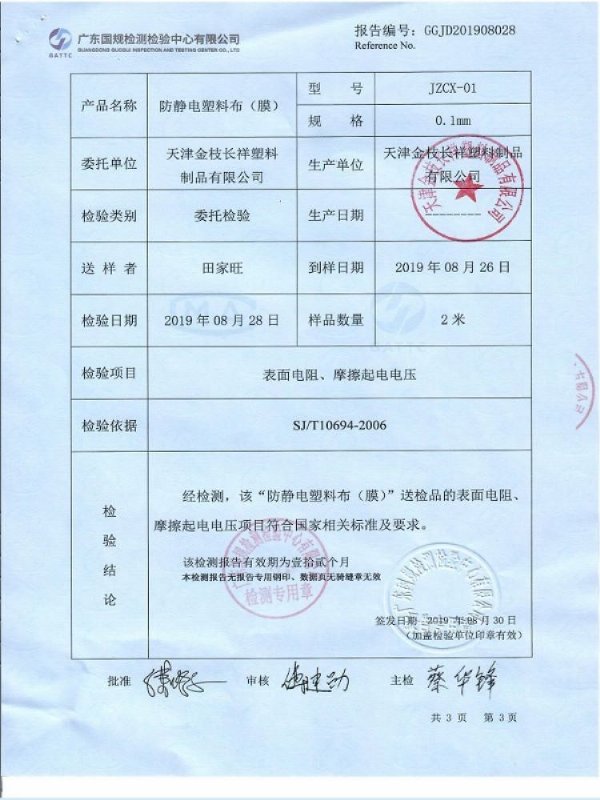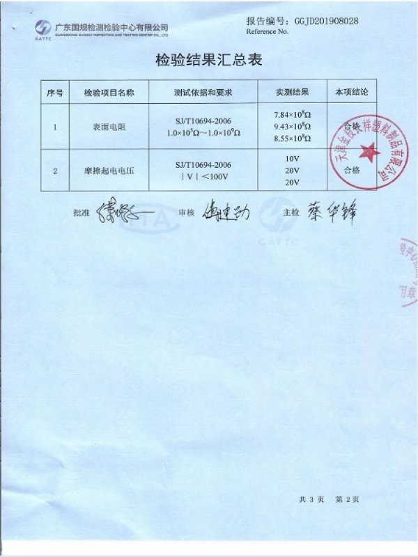 防静电摩擦起电电压: ≤20V 参考检测依据SJ/T10694-2006
