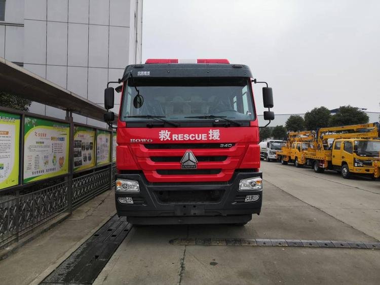采用重汽豪沃ZZ5437V4667E1底盘改装而成。整车由消防员乘员室和车身两大部分组成,乘员室为排半结构,可乘坐2人,该车为外露罐结构,车身前部为水罐和