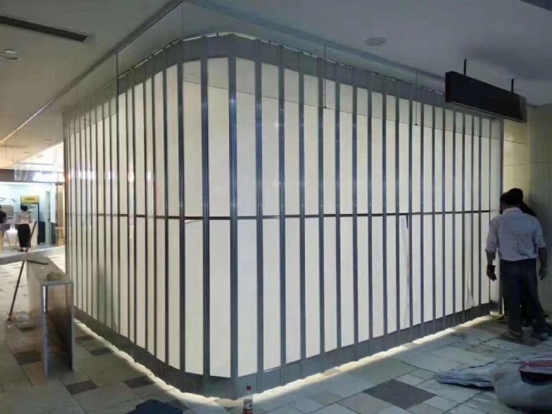 水晶折叠门是采用铝合金边框和透明PC耐力板和*五金配件组合而成,利用*导轨,根据现场门面弧线,弯曲定制。门体