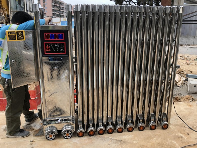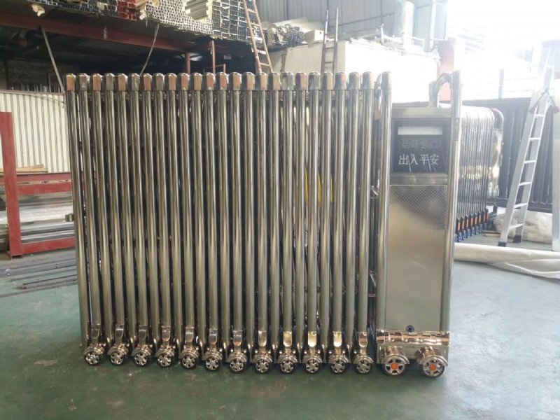 不锈钢采用国际标准不锈钢原材料,经过特殊工艺制管进行折弯焊接定型制成门体。门体**变型坚固耐用。门体用大小连杆连接而成伸缩门,