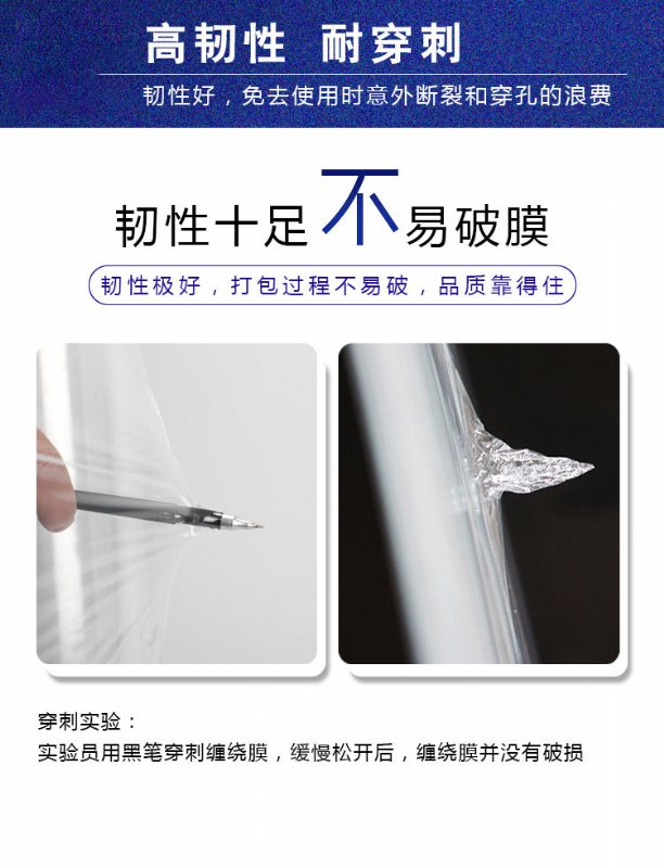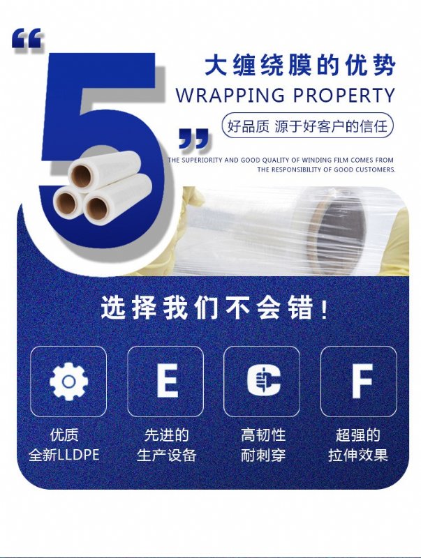 缠绕膜)具有较高的拉伸强度、抗撕裂强度,并具有良好的自粘性,因此能使物体裹成一个整体,防止运输时散落倒塌。具有优良的透明性。包裹物体美观大方,并能使物体防水、防尘、防损坏。广泛用于货物