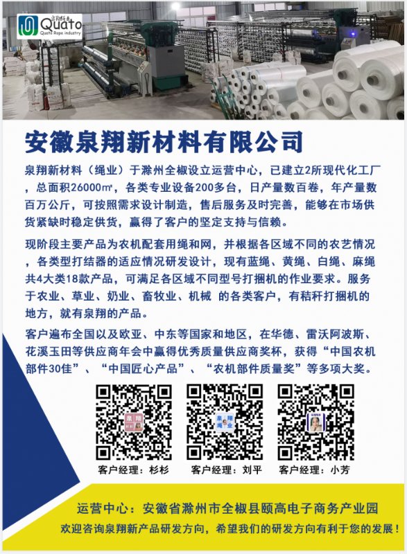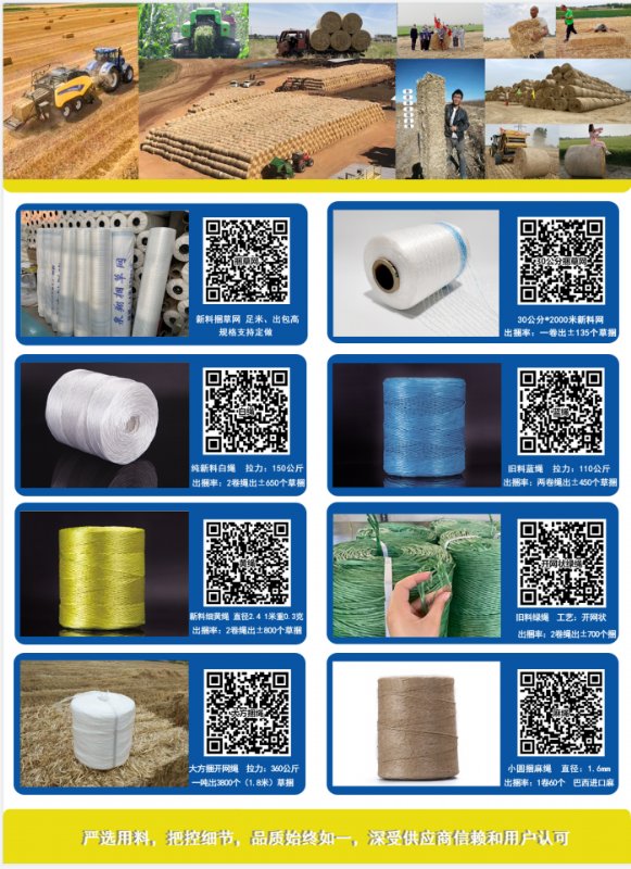 吉林省西部草原曾是产量高那里有苜蓿草,燕麦秸秆,羊草,水稻秸秆、质量好的放牧场和割草场,而它松嫩草原的气候特点和碱性土壤基质决定了羊草的生长。吉林,长春等地区羊草已到收割季节,羊草割后晾晒,1天后,先栈成松疏的小栈,使之慢慢阴干,待含水量降至百分之十六左右,即可集成大栈,用泉翔绳业打捆绳整理成方捆,进行贮藏。泉翔绳业纯新材料白色打捆绳,耐腐蚀性能强,耐用,寿命长,密度轻,不受环境和气温影响,在气温过低的情况下,不会造成绳子偏硬,不影响打结器打结,不断绳,不散捆,不脱扣,拉力在90--150公斤左右,每公斤在280-300米之间,绳子轻,柔软,拉力好,出包率较高,适用于各种田地气候作业。