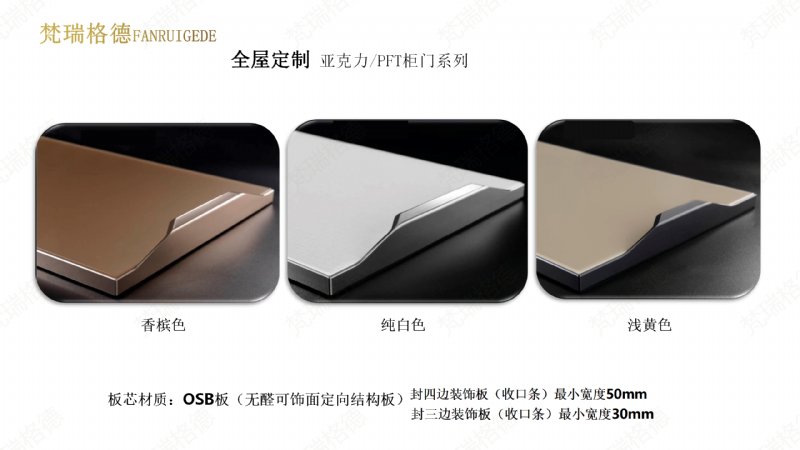 /PET柜门是在无框的基础上再封边位置增加与拉手 同色的金属封边。 采用小转角的方式解决 45度拼角大量加工过程中出现的误差导致的缝隙过大问题。