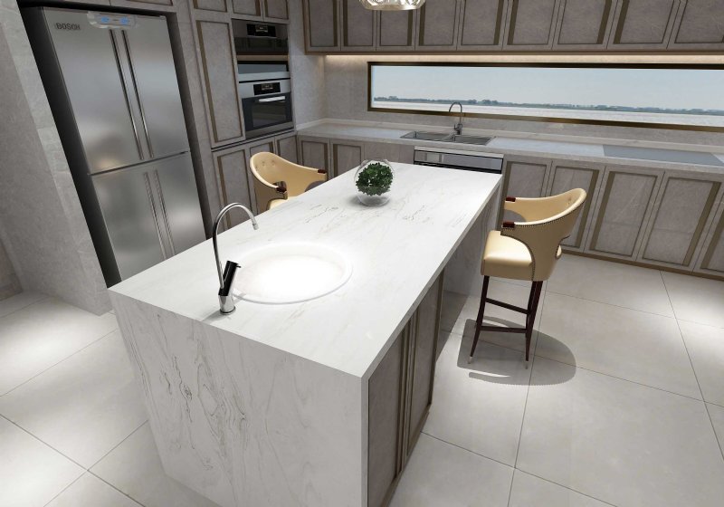 岩板拥有超强的物理性能,耐高温,防火阻燃,同时拥有极高的致密性,渗水率几近于零,污渍难以渗透,无需担忧表面的清洁和卫生问题,因此成为厨房台面、吧台的绝佳选择。