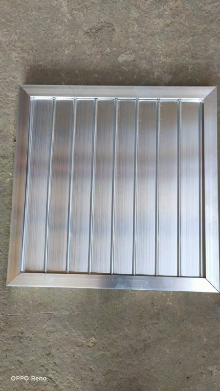 百叶窗) 全铝合金制作,外形尺寸400mm*400mm,活动叶片8片,此风口用于具有正压的烤房自动排气。通常情况下靠风口的百叶自重而自然下垂,隔绝室内外的空气交换,当室内气压大于室外气压时,气压将百叶吹开而向外排气,反之室内气压小于室外气压时,气流不能反向流入室内,该风口有单向止回作用。