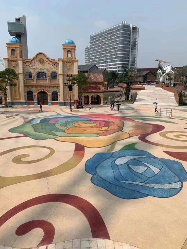 洗砂路面普遍应用在大型休闲游乐场所,对路面的美观度和强度都要求的极为苛刻。洗砂路面的色彩丰富,可实现场地路面与场景主题的花样搭配。