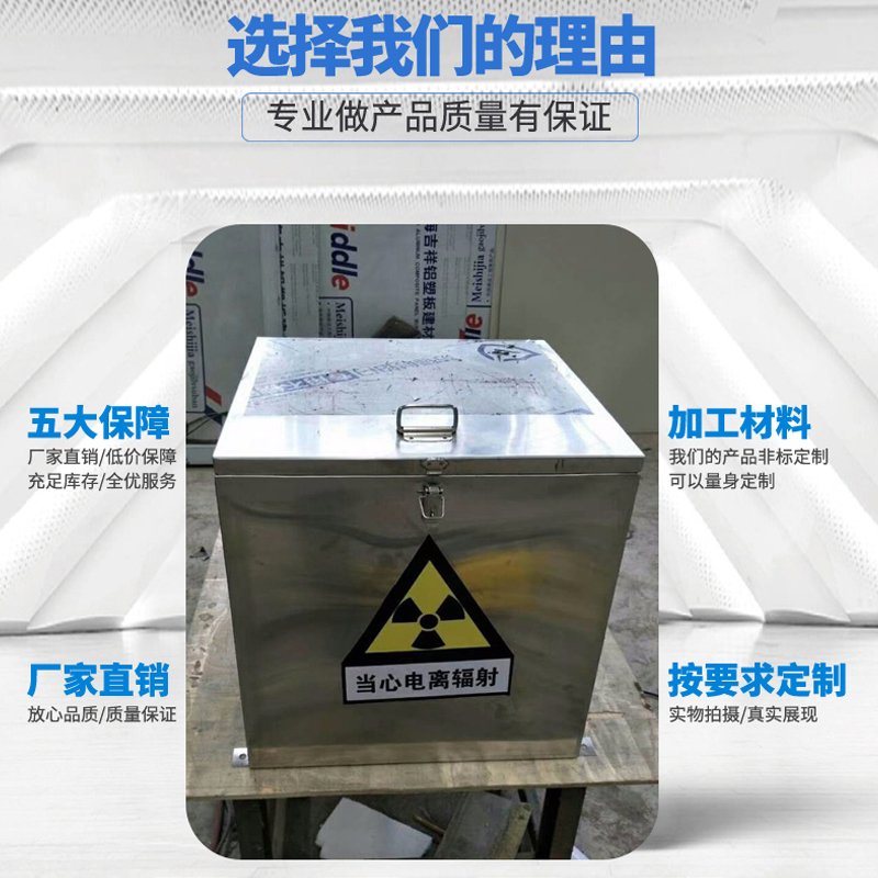 万向轮,箱盖部分和箱体含铅部分嵌合,射线不会泄露,箱体两侧装有符合人手的不锈钢把手。